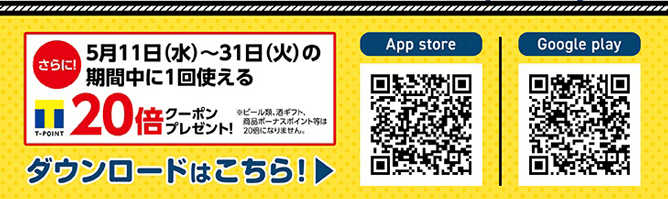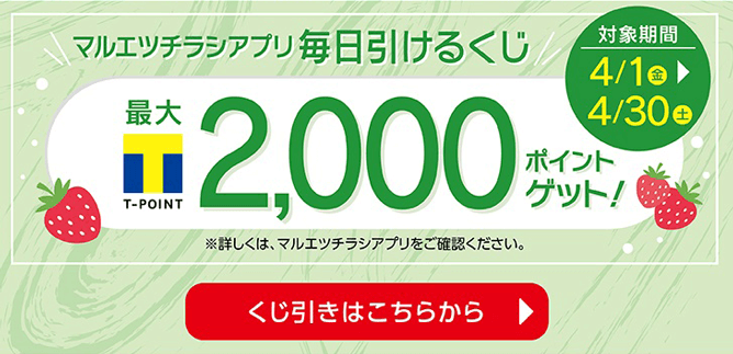 概要 マルエツチラシアプリ 3月キャンペーン (1)アプリならTポイント2倍 (モバイルTカードキャンペーン) (2)はじめてログイン&お買いもので最大80ポイントプレゼント (3)毎日引けるくじ 最大2,000ポイント 期間 21年3月1日(月)~3月31日(水) ※各キャンぺーンの詳細は以下(1)~(5)をご確認ください。通常ポイント1倍、シニアクーポンTポイント5倍(+4倍)、モバイルTカード2倍(+1倍)=Tポイント6倍 ※マルエツアプリ「誕生月Tポイント2倍クーポン」と併用した場合 通常ポイント1倍、誕生月Tポイント2倍(+1倍)、モバイルTカード2倍(+1倍)=Tポイント3倍 ・Scan&Goを利用しTポイントをポイント登録した場合はキャンペーン対象外です ※22年2月28日(月